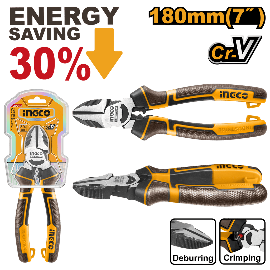 El alicate de corte diagonal INGCO de 7 pulgadas (180mm) es una herramienta profesional de alta resistencia fabricada en acero Cromo-Vanadio (Cr-V) con tecnología de ahorro de fuerza del 30%. Diseñado para cortes precisos y limpios en cables, alambres y componentes eléctricos, este modelo HHLDCP28180 combina durabilidad industrial con ergonomía avanzada para uso profesional intensivo.