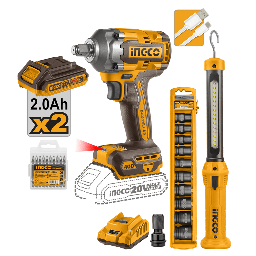 COMBO INGCO UCOSLI23048: 1 LLAVE DE IMPACTO 20V 400NM (UCIWLI2040) 1 LAMPARA (HWLI35261) 1 JUEGO DADOS DE IMPACTO 10 PZS 2 BATERIAS 20V 2AH (FBLI20011) 1 CARGADOR (UFCLI2001)