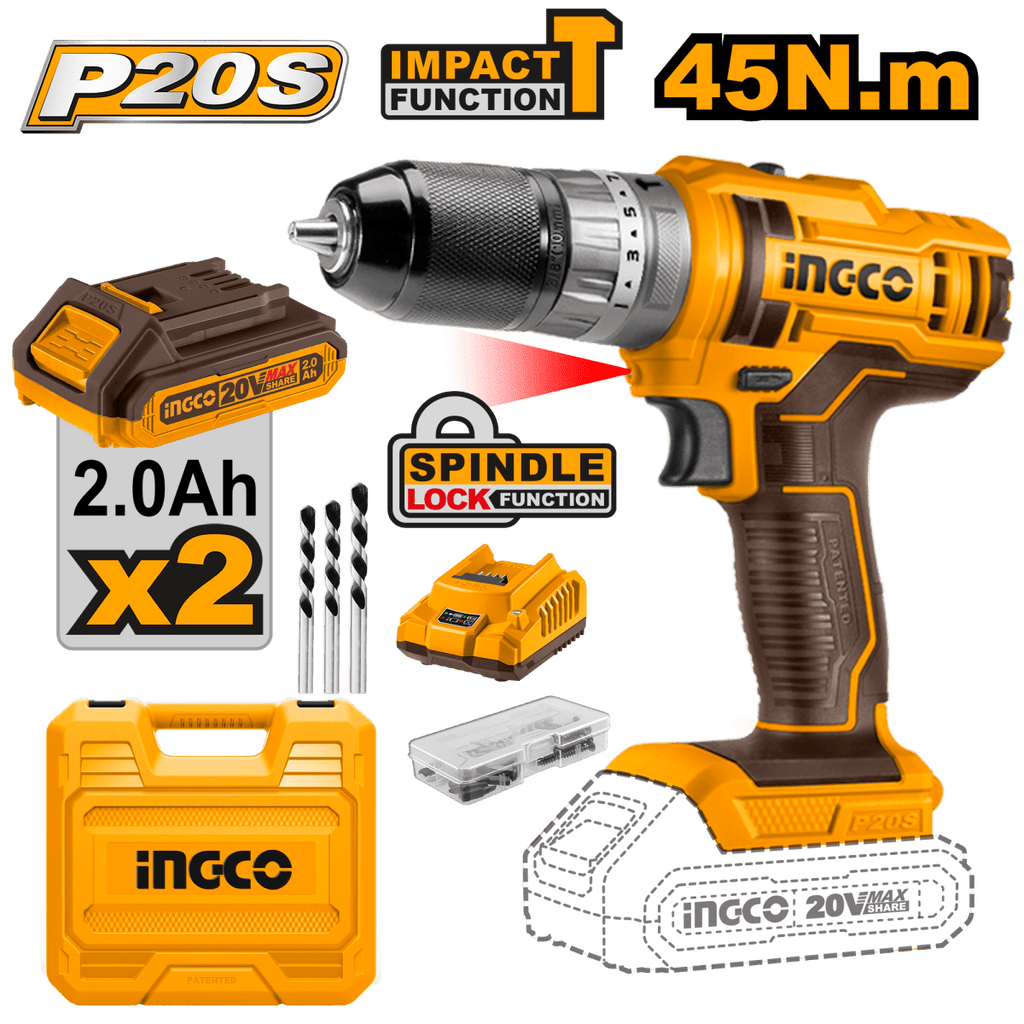 TALADRO M3/8 20V 45NM IMPACTO 2 BATERIAS Y CARGADOR INGCO UCIDLI201452