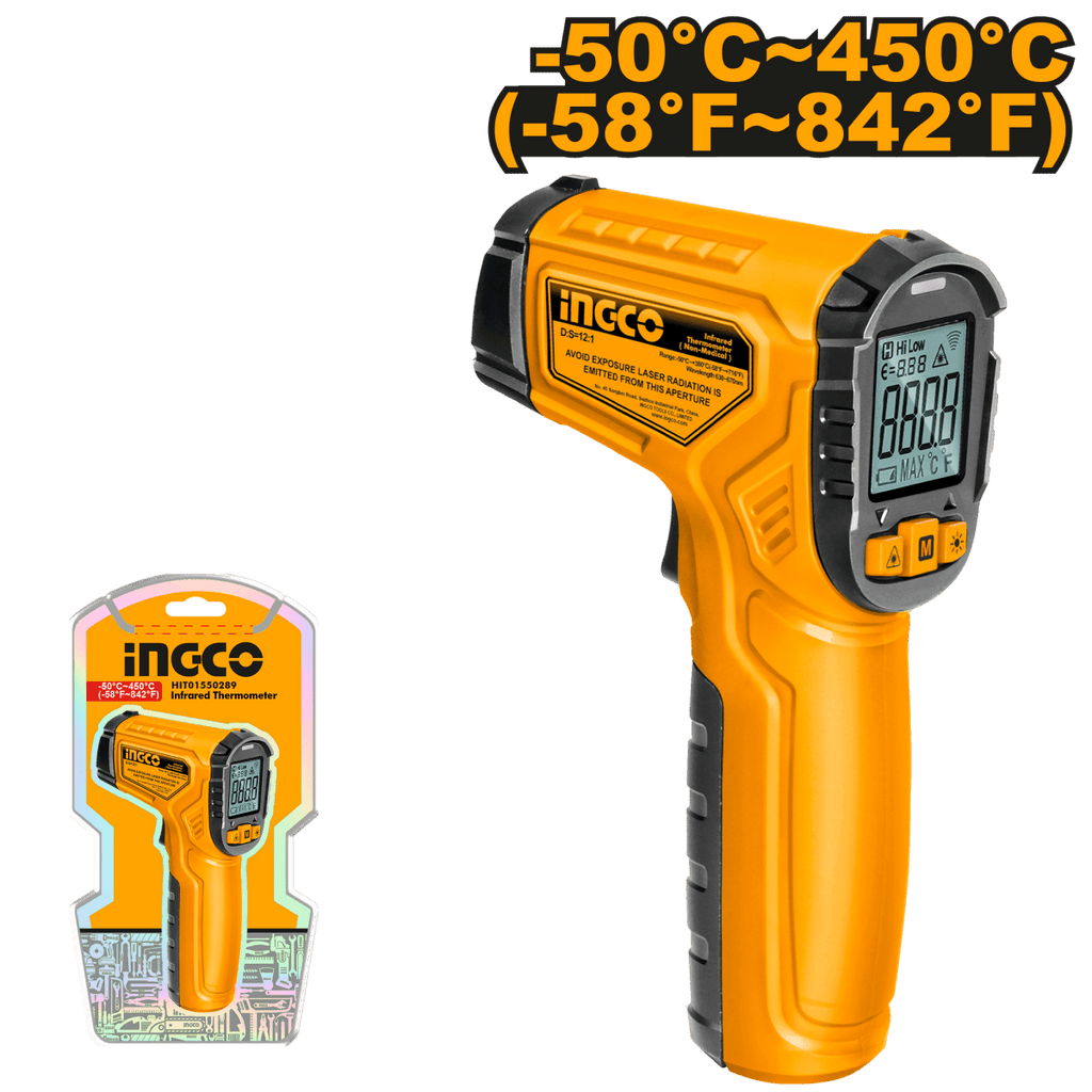 Temperatura: -50 °C ~ 450 °C (-58 °F ~ 842 °F) Tiempo de respuesta: <0,5 s D:S = 12:1 Apagado automático Luz de fondo No apto para personas Con 2 pilas AAA R03 Empaquetado en blíster doble